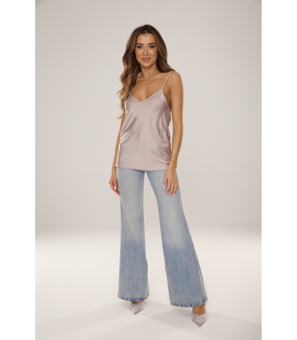 Top damski na wąskim ramiączku, regulowanym. Wykonany z satyny. Idealny pod marynarkę czy sweter.