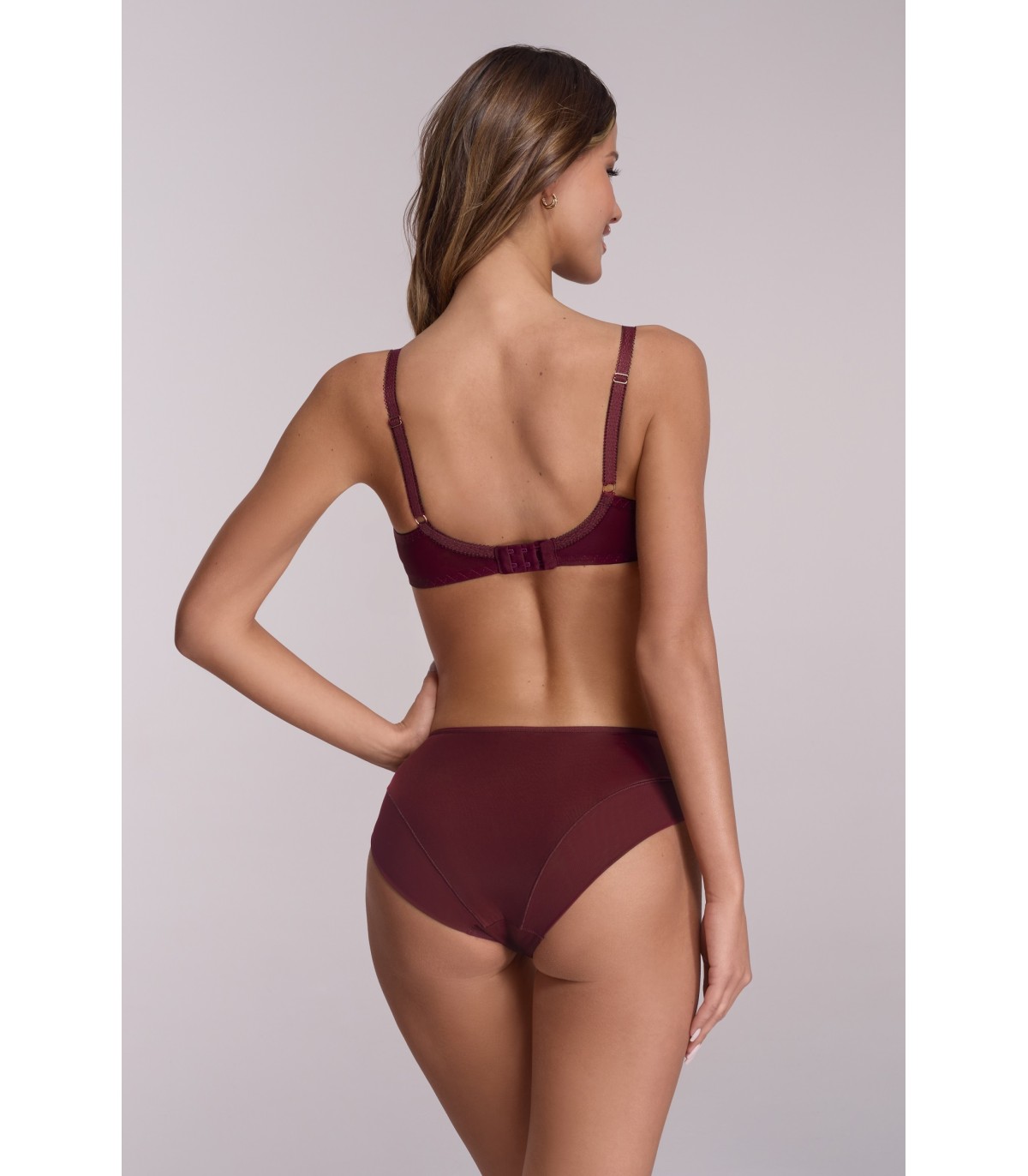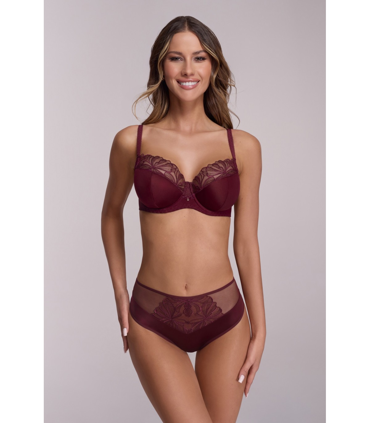 Nasycony burgund to kwintesencja elegancji – zanurz się w intensywności Majesty i poczuj jej wytrawny urok na własnej skórze. Miseczki typu semi soft całościowo obejmują biust, wspierając go od spodu miękką pianką, a stabilny haft w górnych partiach gładko przylega do krzywizn naturalnie zaokrąglonych piersi. Głęboka winna barwa dzianiny oraz kwiatowego haftu wydobywa z AV 2196 szlachetną elegancję, a umieszczona na mostku delikatna kokardka ze złotym koralikiem dodaje modelowi wdzięku. Ozdobne figi i brazyliany z sensualnymi prześwitami będą perfekcyjnym uzupełnieniem kunsztownej Majesty.