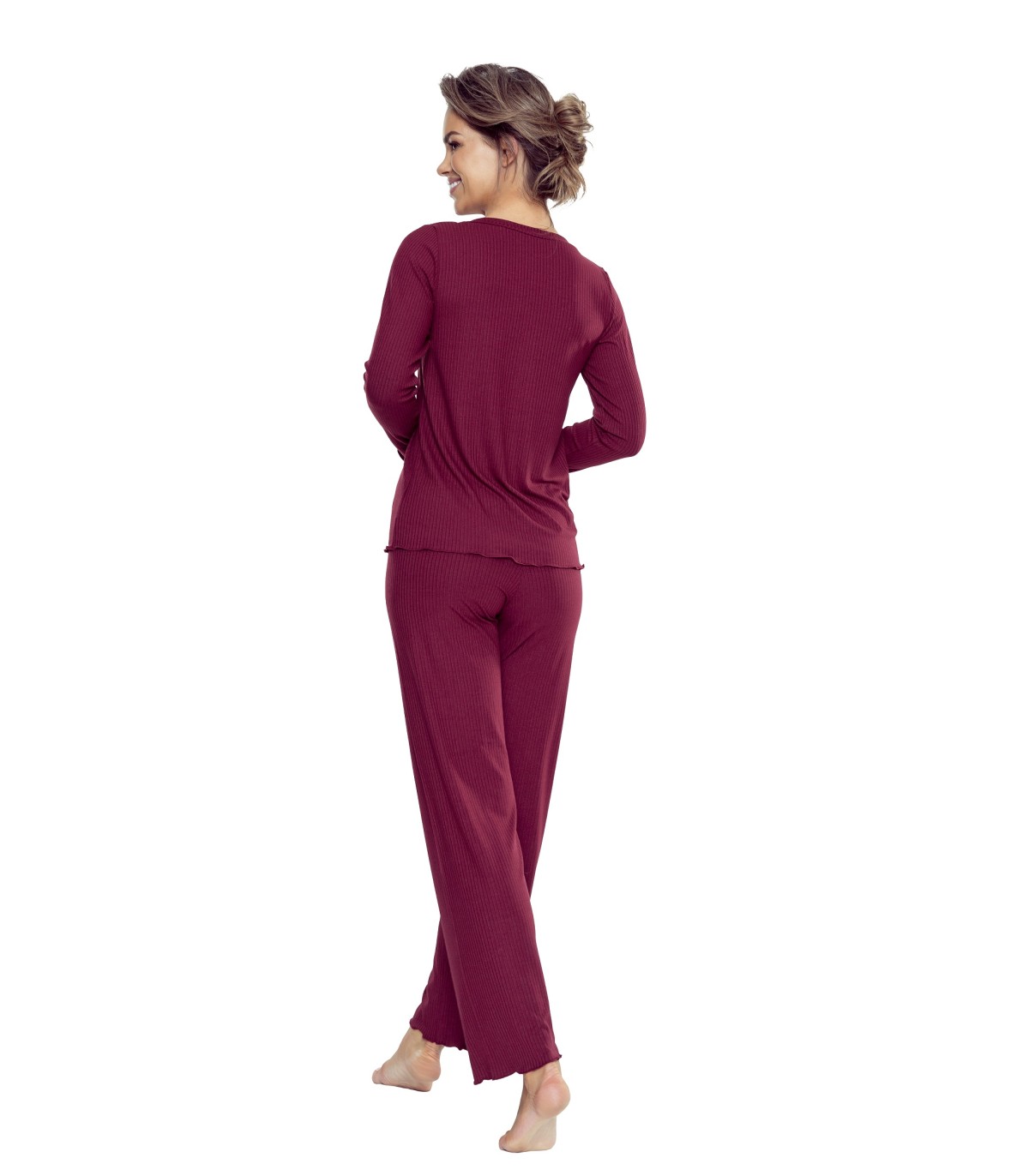 Wygodny komplet składający się z długich spodni i bluzki z dekoltem w serek. Wykonany z lekkiej i oddychającej wiskozy, idealnie sprawdzi się zarówno jako piżama, jak i homewear. Delikatna prążkowana struktura materiału nadaje całości subtelny charakter, a luźny fason zapewnia pełen komfort noszenia. Bluzka zakończona ozdobną falą przy dole, a spodnie mają prostą nogawkę, która nie krępuje ruchów.